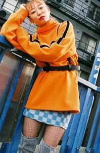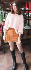 示范搭配:橙色短裙+粉红色毛衣+黑色靴子+粉红背包