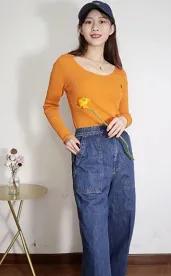 示范搭配:橙色毛衣外套+蓝色牛仔裤+淡黄色靴子+黑色背包+白色打底衬衫