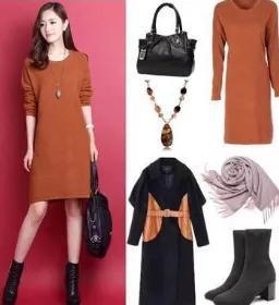 示范搭配:黑色外套+橙色中长款打底裙+黑色高跟鞋+灰色毛巾+黑色背包