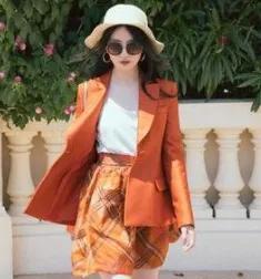 橙色配上花格子,非常时尚,非常显白,显性感,拉长了身材比例,能把自己打扮得很棒,吸引了更多人的注意,整个人都显得很活泼。
