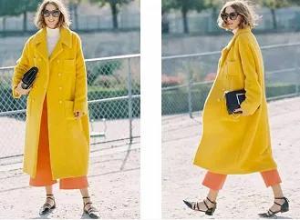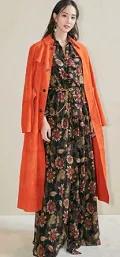 示范搭配:橙色外套+碎花长裙+黑色单鞋+橙子手提包