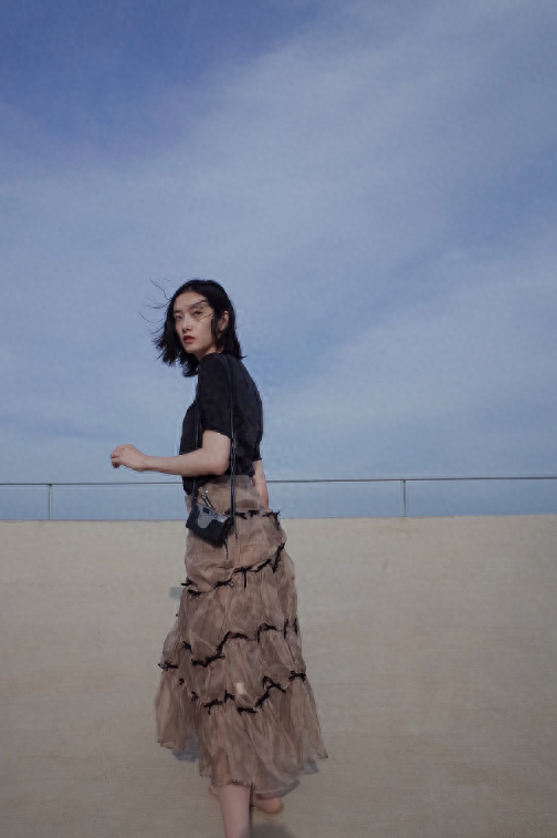 黑色T恤营造出一股神秘高冷的感觉,很适合cici的气质。宽松的款式最好像图片里一样扎进裙子里,才不会显得累赘又拉高了腰线,打造出逆天大长腿的效果。驼色系半身裙用迷幻的褶皱设计和塑料面料打造迷离的感觉,超级有个性。