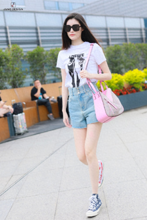 想要显高的话就得穿高腰款,牛仔短裤也不例外!这款高腰牛仔短裤让何穗的腰线在本就优于其他人的情况下,再上一个台阶,腿长两米已经不能拿来形容她了。灰蓝色也很符合她今天的校园青春风路线,超级减龄。
