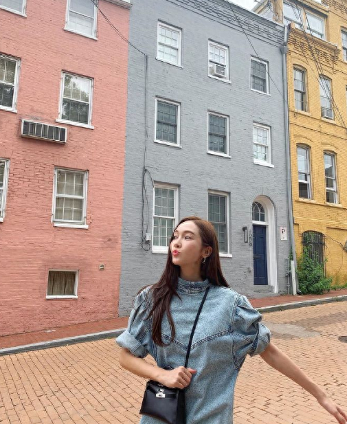 牛仔裙一般都是作为半身裙出镜,但是用来当做连衣裙也很出彩哦。杰西卡不愧有自己的时尚品牌,搭配起衣服来很有前卫感。半高领牛仔裙自带一股复古风,宽松的袖子不再是减分项微微卷起来更显随性与自然。