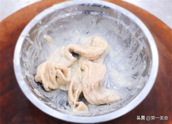 5.把猪肝切成薄片,用清水冲洗干净放入盆中,加入食盐一勺,料酒10克,胡椒粉2克,再抓入一小撮淀粉,充分抓匀以后浸泡10分钟,去除猪肝中的血水和毒素。