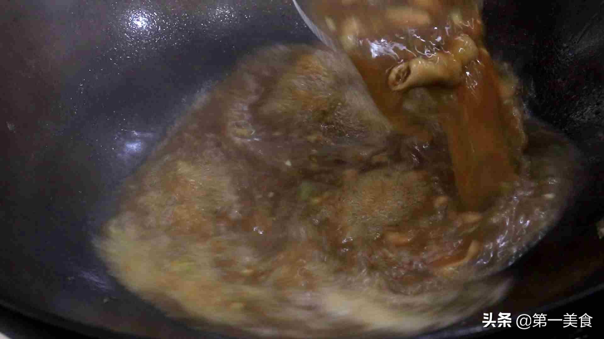 8.把锅烧热加入适量的植物油,油温五成热时倒入葱姜蒜一起爆香,加入一勺黄豆酱增加酱香味,开小火把酱料炒散炒香,然后把卤汤倒入锅中搅拌均匀,让酱香味融入到汤里面。