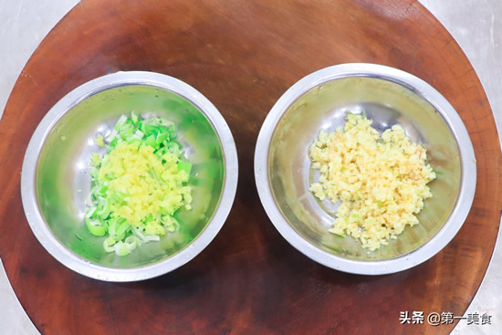 6.接着切一点小料,大蒜一把用力拍扁后切成蒜末,大葱破开切成葱花,生姜切成姜末放在一起备用。