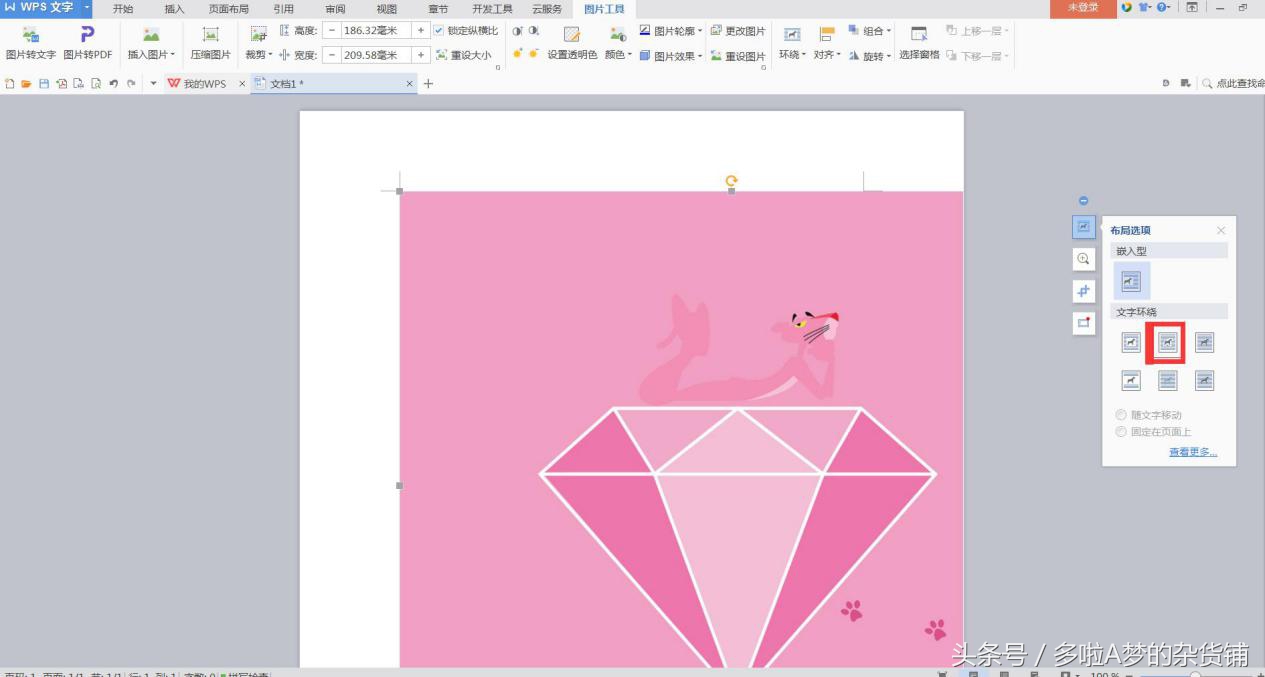 当然,图片不是那么“听话”的,直接拉动调整符号是不能随心所欲的把图片调整到合适的幅度的,所以我们要在“布局选项”里将图片的格式调为“悬浮于文字上方”,WPS和Word两种办公软件里都有这个选项,大家需要细心的寻找一下。