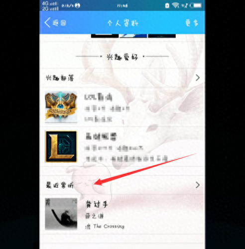 2.我们打开她的个人资料以后,往下滑,就会看到她的“最近常听”,点开“最近常听”,就会看到她创建的歌单,包括她喜欢的歌曲,点开她喜欢的歌曲,我们就可以知道她喜欢的音乐风格、流派等等,也可以帮我们更好的了解这个人的音乐品味。