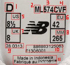 看到1那里代表鞋楦宽度,就是鞋的肥瘦,D是男鞋标准宽;2那里代表款式,M是男,W是女,K是儿童,有的是其他字母,代表鞋的类型功能,并不绝对;3那里574代表鞋型号,574的很常见的;4那里一般代表颜色;