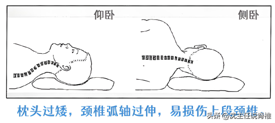 ,您看看我们的头部被抬起,颈轴过屈,相当于低头睡觉,久而久之,容易导致 颈椎曲度变直或者反弓