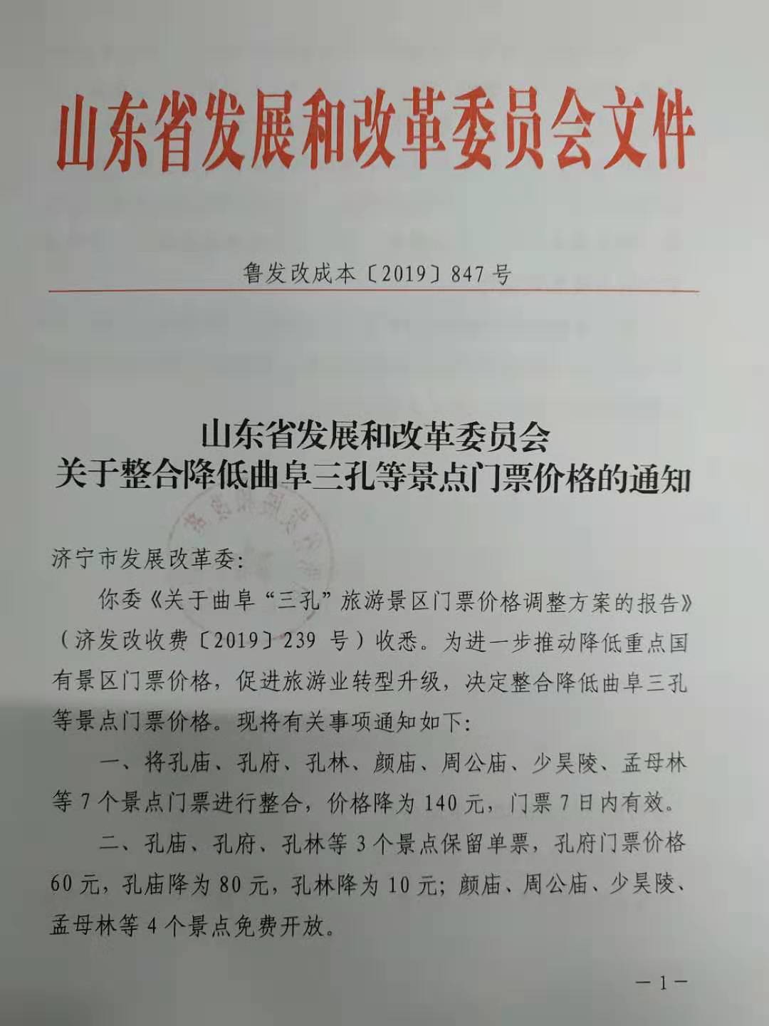 大众网·海报新闻济南9月12日讯(记者 吴军林)12日,山东省发展和改革委员会印发关于整合降低曲阜三孔等景点门票价格的通知。2019年10月1日起,将孔庙、孔府、孔林、颜庙、周公庙、少昊陵、孟母林等7个景点门票进行整合,价格降为140元,门票7日内有效。