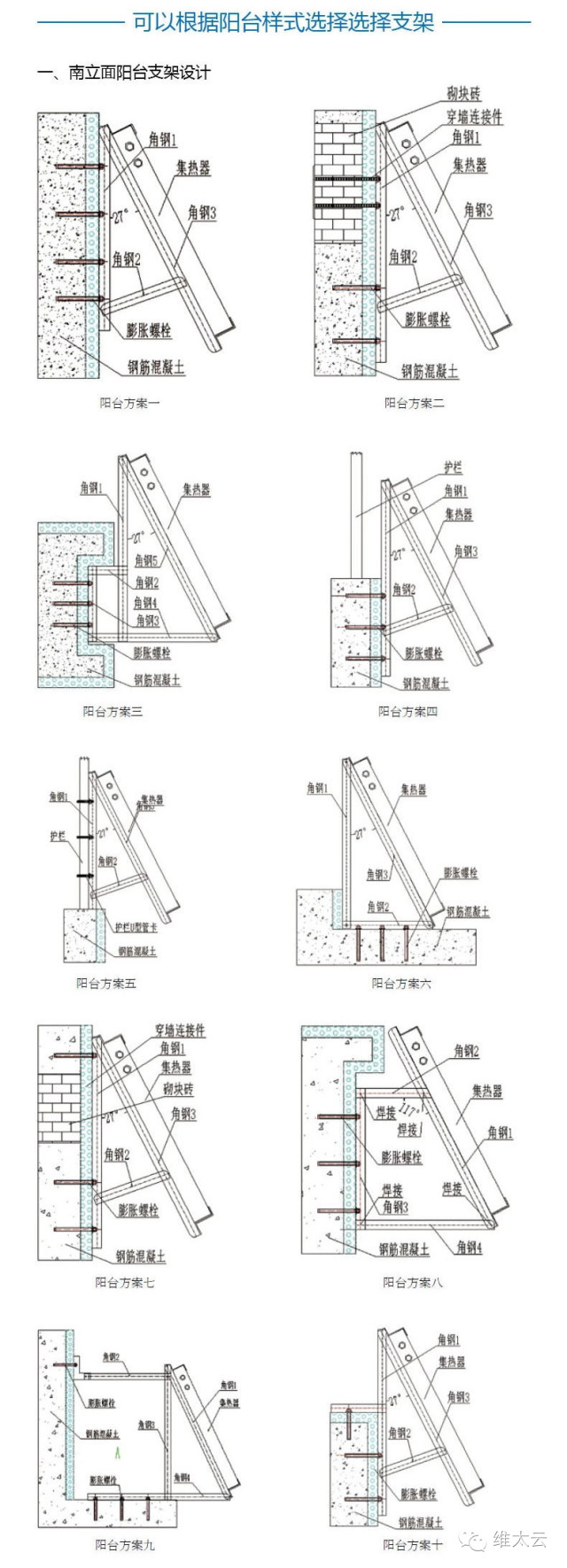 1、热水器一般常安装在建筑物的水平屋面上,当只夏季使用时,其集热板与地面夹角宜比当地纬度少10°左右为最佳。2、集热器安装朝向,以接收板朝向正南为最佳,如实际安装条件有困难,也可偏东或偏西15°角安装。3、安装在屋面时,应考虑水箱、集热板和水的重量会加大楼板的荷载,应经计算后再安装。当建筑物较高时,应考虑风力的影响。