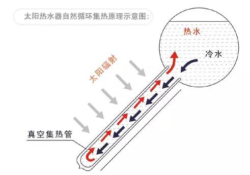 1、吸热过程真空管式太阳能热水器:太阳辐射透过真空管的外管,然后被集热镀膜吸收后沿内管壁传递到管内的水,此时水受热而温度逐渐升高,比重减小而上升,形成一个向上的动力,构成一个热虹吸系统。随着热水的不断上移并储存在储水箱上部,同时温度较低的水沿管的另一侧不断补充如此循环往复,最终整箱水都升高至一定的温度。