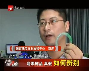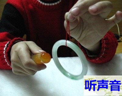 同时这也可以应用到鉴别翡翠手镯的真假上来,我们拿绳子悬挂玉镯,用玛瑙棒轻敲玉镯,翡翠A货的声音清脆、清晰;而翡翠B货或B+C手镯的声音就比较沉闷、沙哑。