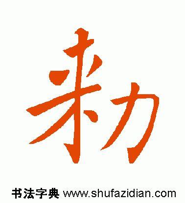 右部“力”旁整体左斜,位置靠下。横折钩注意起笔位置,横画勿重,向右平行,略呈仰视,到位后向右下方稍重顿笔、稍内擫向左下方写斜竖,要看准角度,平稳有力,到位后“跪笔弹锋”挑钩,钩勿大;最后撇笔起笔靠近横画的左端,比横画稍高,注意行笔角度,遒劲有力,收于左部末点的下面。
