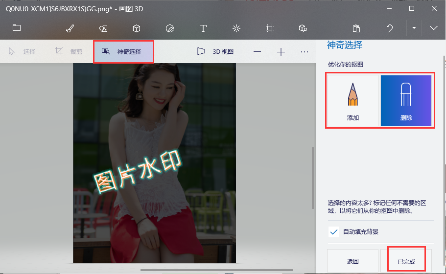 用画图3D打开图片,点击【神奇选择】,然后框选水印位置,通过【添加】、【删除】抠选出图片里的水印,点击【已完成】即可。
