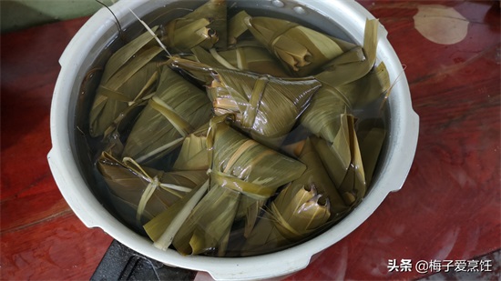 4、全部包好以后将粽子一个个码在高压锅里,我这一个锅大概能装30个左右,在里面倒满清水,水一定要没过粽子,然后扣上个盖子,开锅以后调中火将它煮熟,时间到后不要拔掉高压锅帽子放气,让它自然放气,让粽子在锅多焖几分钟。
