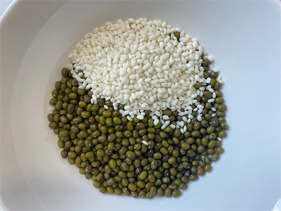 绿豆和糯米淘洗干净备用。
