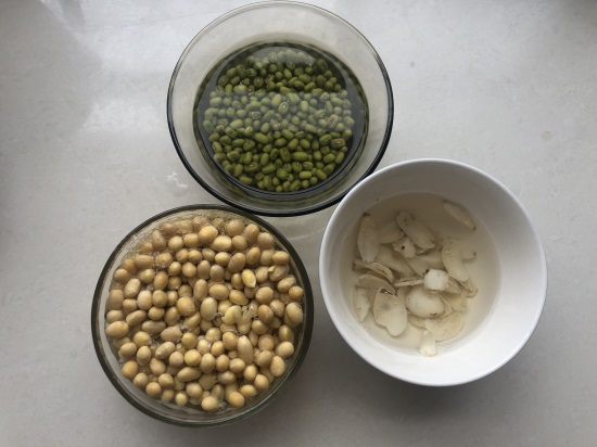 绿豆和黄豆提前浸泡一段时间,再准备点百合,浸泡片刻备用。