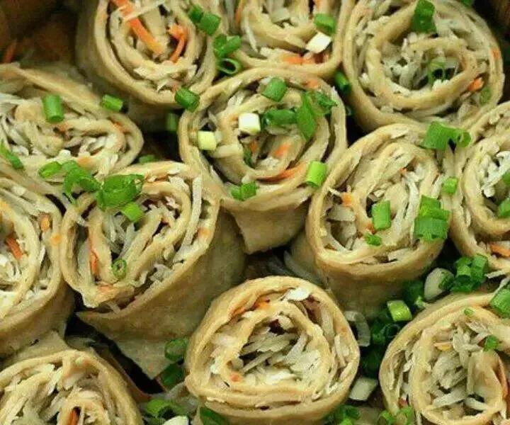 5,把混合好的土豆丝萝卜丝均匀的铺到面皮上,卷起来,切成均匀的段(4厘米左右)即可,然后放到笼屉,上锅蒸熟即可。