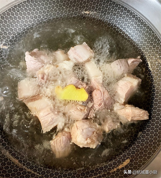 2、 鲜猪肉切小块,跟红烧肉差不多大小的块即可,冷水下锅,放生姜和料酒大火烧开去浮沫,这个汤汁过筛后别倒掉,等一下还要用到。