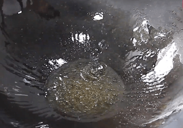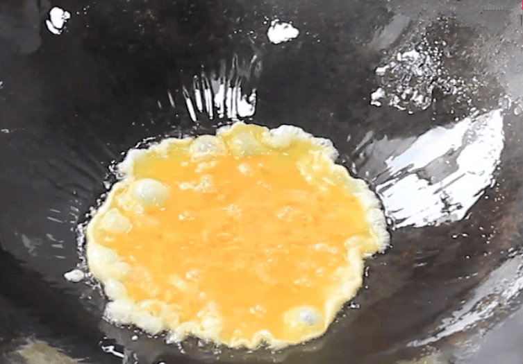 5.炒锅加热,放入宽油滑锅。油热后将宽油倒出锅中加入半勺凉油,然后将准备好的鸡蛋液倒入里面大火翻炒熟透,出锅装盘。