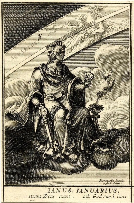 January是以罗马神话中双面神杰纳斯(Janus)的名字命名的。他负责司守门户以及万物的始末,这让他很适合代表一年的开始。事实上,杰纳斯通常以双面孔示人,一面回顾过去,一面注视未来,而这经常被视为新的一年的特征;这也使得它的引申词组“Janus word”(双面词)表示兼有两种相反含义的词。