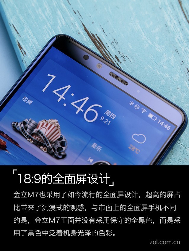 金立M7所采用的是一块屏幕比例为18:9的6.01英寸2160*1080分辨率的AMOLED显示屏,金立官方给出的数据显示,搭载这块屏幕的金立M7TP屏占比高达90%,边框极窄,十分逼近无边框效果,因此而被大家认可为全面屏手机。