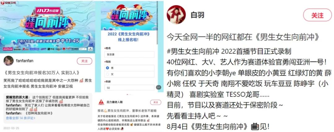 B站甚至借势与安徽卫视合作推出了饱含B站特色的同题材节目《哔哩哔哩向前冲》。