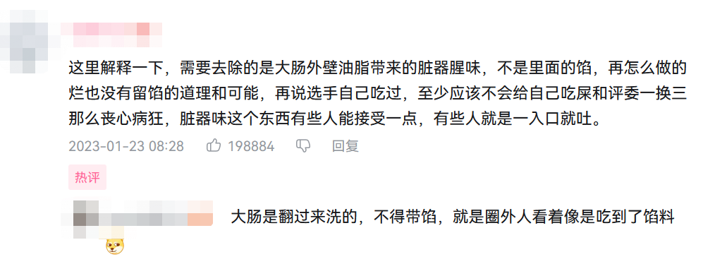 “我去除了大部分肠的腥味,但是我保留了一部分,我觉得保留一部分才知道你吃的是大肠。”