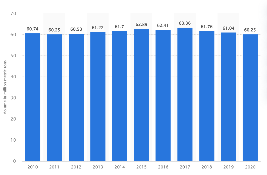 据全球统计数据库Statista,中国2010年至2020年的西瓜产量均突破6000万吨。第二大西瓜生产国土耳其,产量却远不及中国的十分之一。