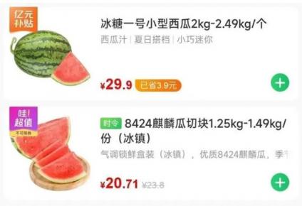 在线上,叮咚超市,从整颗瓜的价格看,最便宜的是标注4kg国产麒麟瓜,售价45.9元,相当于5.74元/斤,最贵的是1kg的苏梦6号小糖丸西瓜,21.9元/个。