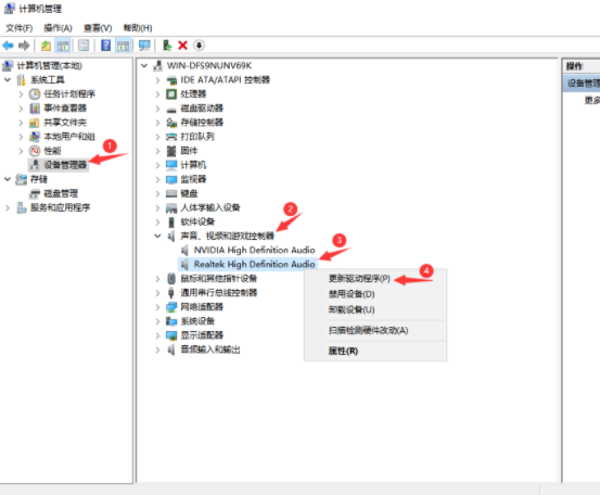 2.在网络适配器页面,鼠标双击打开声音设备,点击列中的硬件配置,选择选择“升级驱动软件”。
