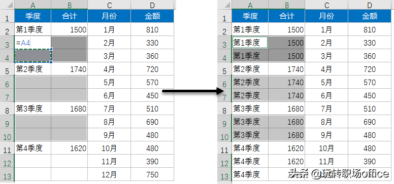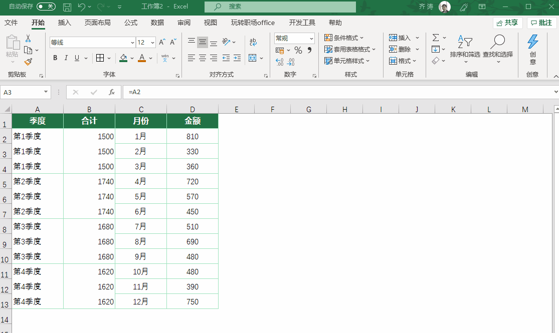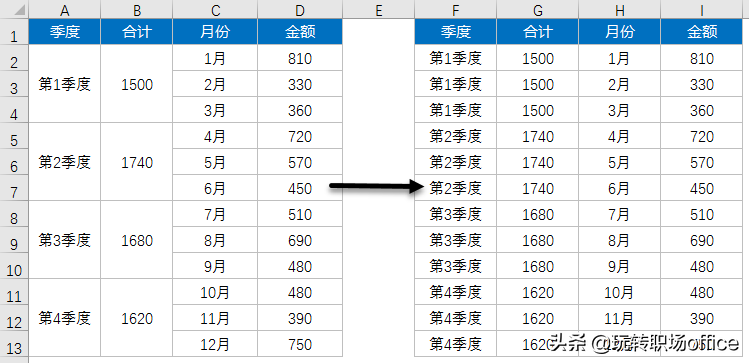 今天教给大家批量取消合并单元格并填充内容的技巧。