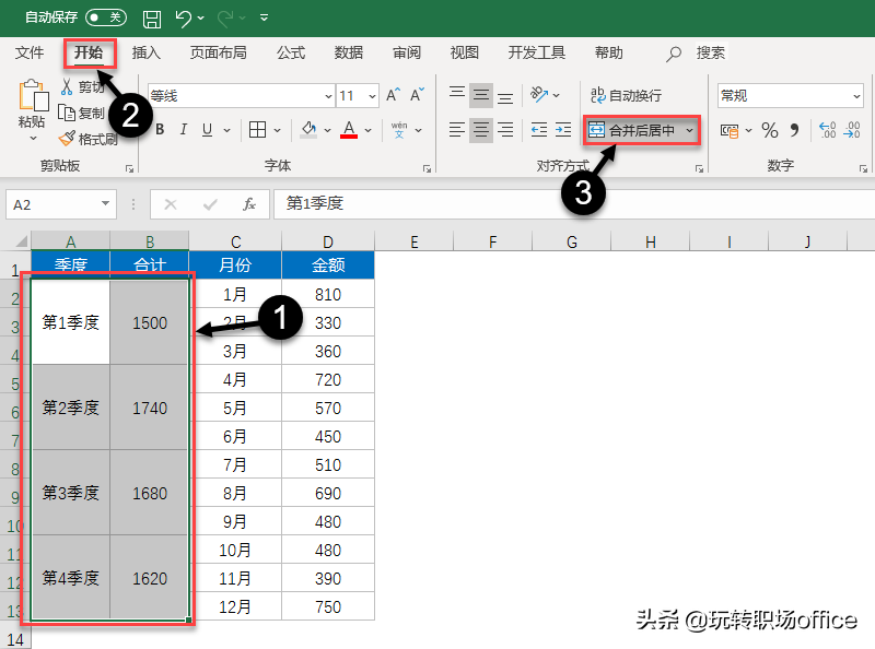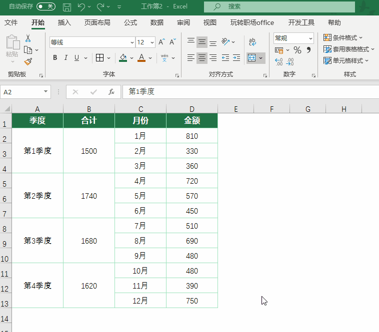 选中A2:B13数据区域,点击【合并后居中】,取消合并状态。
