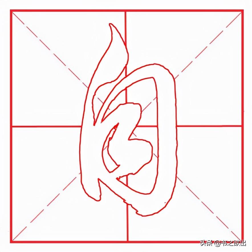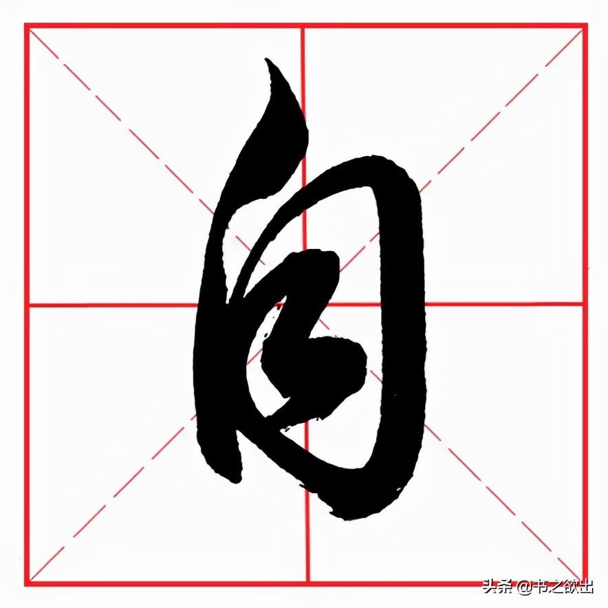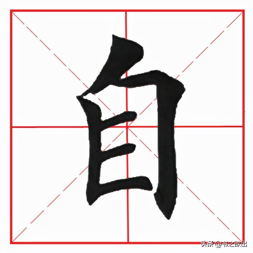 整体字形偏高、偏窄,不要写宽。首撇斜切落笔,稍厚重,注意行笔角度,短促有力;竖画起笔挡住首撇撇尖,稍带弧度,略左斜;横折位于撇肚处虚接起笔,横画勿重,稍抗肩,不要写长,然后顿笔向下内擫写竖,注意顿笔的笔法和角度,顿角偏下,竖身稍重,稍长,与左竖略呈相背之势,收笔稍回锋作挑钩状;中间两个横画布白均匀,抗肩平行等距;下横从左竖里面实接起笔,与上横等距,先陡后平,略呈拱形。