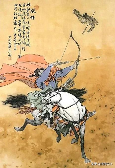 一声弓鸣弦响,像一道闪电击破银瓶。将军的角弓带着哨音,瞬间消逝在前方。寒风猎猎,惊惶的小兽四处逃窜。