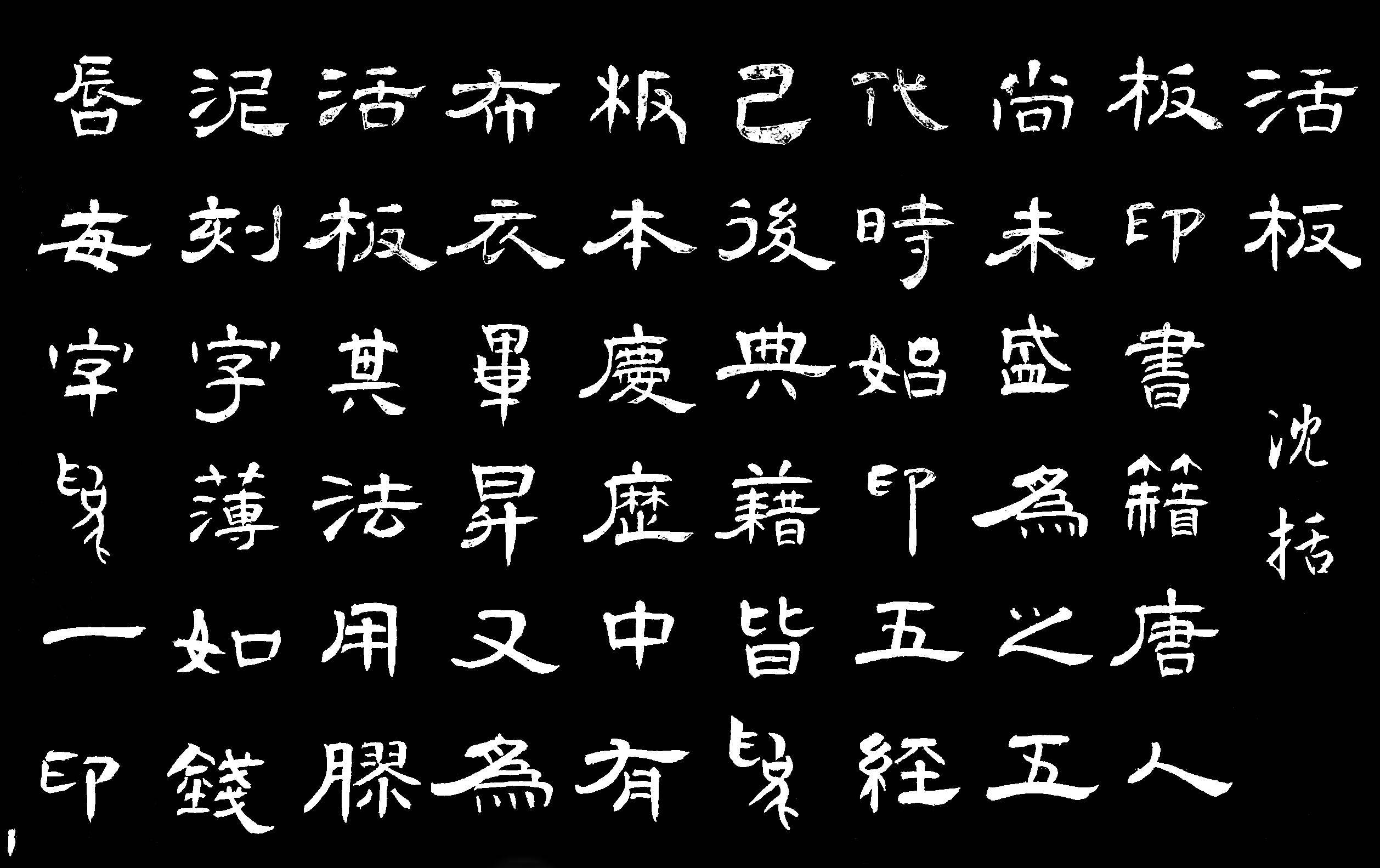 宋朝庆历年间,有个叫毕昇的平民,又发明了活字版(印刷)。它的方法是:用黏土刻字,字模薄得像铜钱边缘似的,每个字刻一个字模,用火烧使它坚硬。先设置一块铁板,在它的上面用松脂、蜡混合着纸灰这一类东西覆盖好。想要印刷,就把一个铁框子放在铁板上面,于是在铁框内密密地排上字模,排满了一铁框就成为一块印版,把它拿到火上烘烤;待铁板上的药物稍稍熔化,就用一块平板按在字模上面,那么(所有排在板上的)字模就像磨刀石那样平。如果只印两三本,不能算是简便;如果印几十乃至成百上千本,那就极其快速。通常是做两块铁板,这一块在印刷,那一块已另外在排字了,这块印刷才完,第二块板已经准备好了,两块相互交替使用,很短的时间就能完成。每一个字都有好几个印模,像“之”、“也”等字,每个字有二十多个印模,用来准备同一版内有重复的字。不用时,就用纸条给它们作标志,(按照字的韵部分类)每个韵部做一个标签,用木格子把它们贮存起来。遇到平时没有准备的生僻字,随即刻制,用草烧火烘烤,很快就能制成功。不用木料制作字模的原因,是因为木的纹理有疏有密,一沾水就会变得高低不平,再加上木刻的字会和药物粘在一起,(拆板时)拿不下来,不像用胶泥烧制的字模,印完后再用火一烤,使药物熔化,用手轻轻一掸,那些字模就会自己掉下来,一点也不会被药物弄脏。
