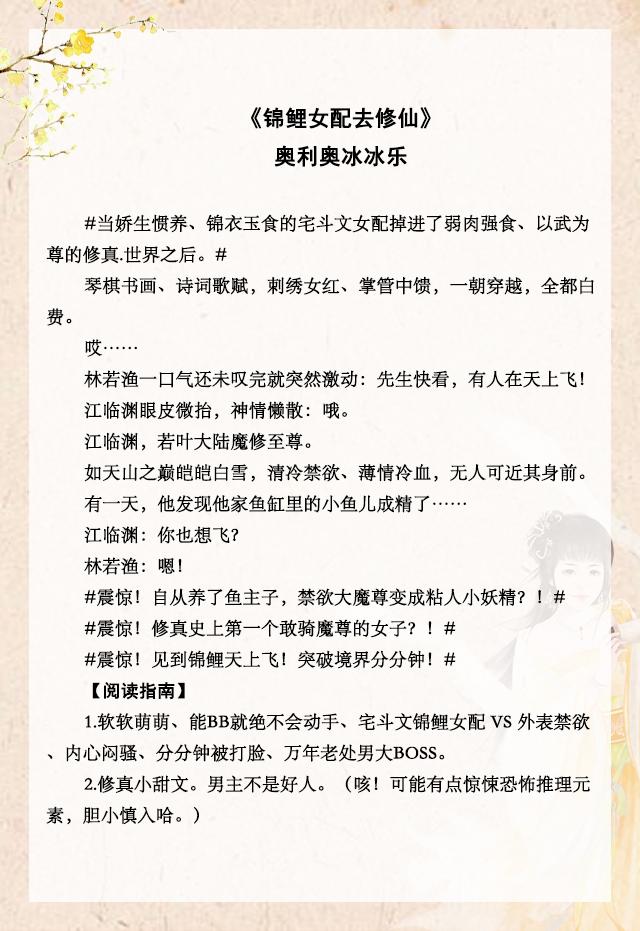 短评:古言,仙侠。女主呆萌可爱,原本是宅斗文锦鲤女配,身份尊贵,气运极好,被所有人视为祥瑞,娇养着到了十二岁。一觉醒来,她穿越到了修真界,成了几百年才出一条的天池锦鲤,被男主精心饲养。男主是魔尊大佬,桀骜不驯,肆意妄为,戾气深重,实力超强,后面慢慢被小可爱女主治愈。剧情稍微有些复杂,一环紧扣一环,可以阅读。