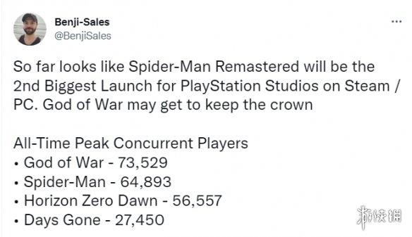 《漫威蜘蛛侠:复刻版》PC版已发售两天,但据统计起Steam在线峰值仍不及《战神4》,索尼第一方游戏在Steam的 在线人数峰值如下: