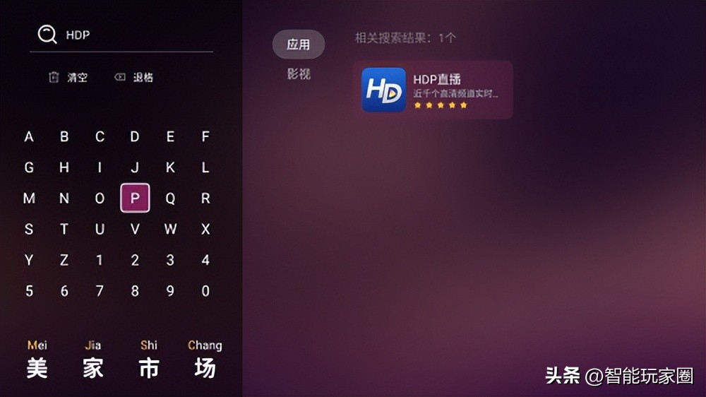 1、打开美家市场,遥控按到左上角搜索HDP直播的首字母“hdpzb”