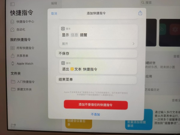把添加快捷指令拉这个页面拉到最底部点击添加不受信任的快捷指令