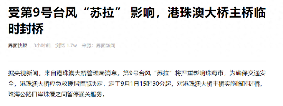 并且来自港珠澳大桥管理局发布的消息已经指出了,第9号台风“苏拉”将严重影响珠海市,为确保交通安全,已暂停通关服务。