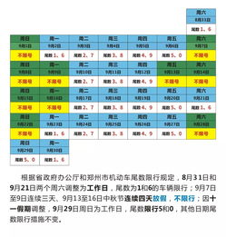 此外,郑州市还对周末进行限号。周六限行的车牌尾号为4和9,限行时段为早上7:30至12:00。而周日限行的车牌尾号为3和8,限行时段同样为早上7:30至12:00。这样的安排也是为了减少周末购物、休闲等活动对交通造成的影响。