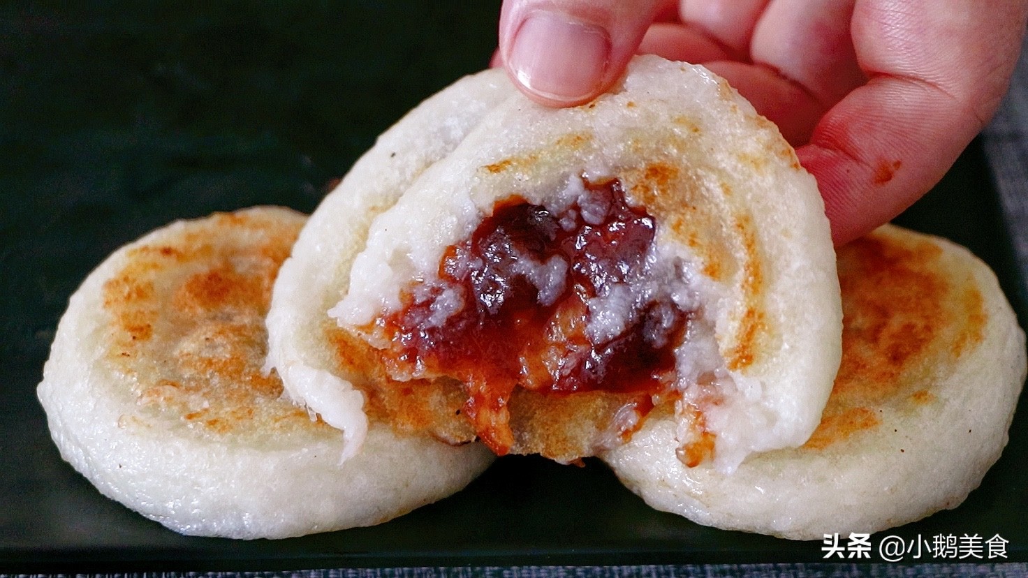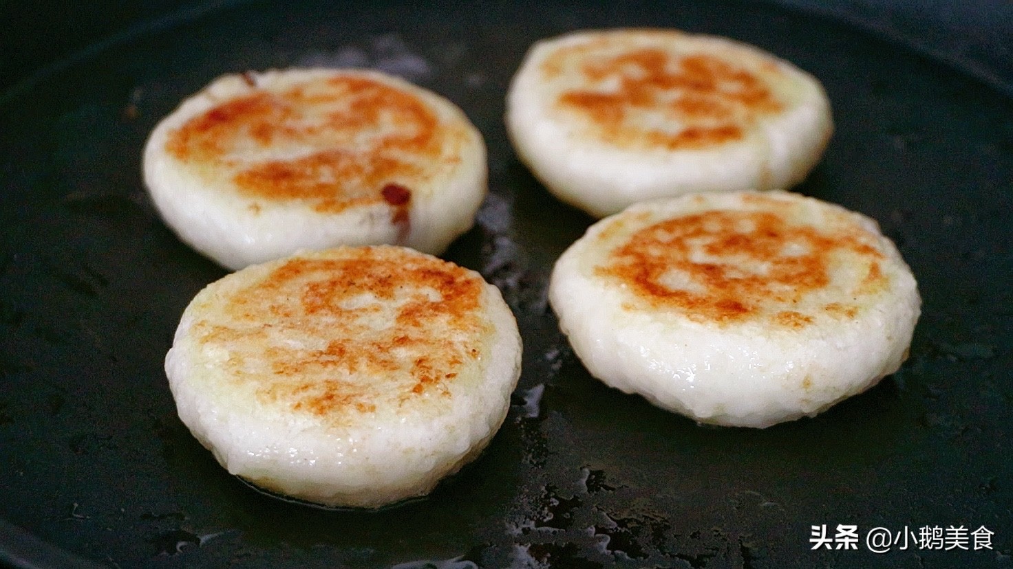 4、还可以放入锅中烙至两面金黄酥脆。这样外酥里糯、香甜细腻,好吃翻倍。比用糯米粉做的糯米糍粑更好吃。