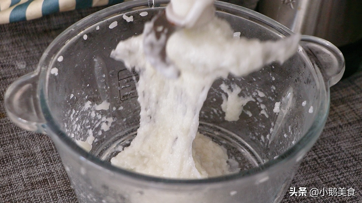 2、分次加入绞肉机中,按下绞肉键绞7秒左右,绞到糯米拉丝即可。没有绞肉机的,可以用擀面杖把糯米捣碎至拉丝状态。
