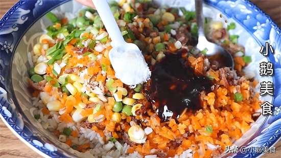 1、小半碗糯米提前浸泡4小时,滤干水分。2根小葱切成葱花,1个香菇切丁,1小段胡萝卜切末,1小把豌豆粒,1小把玉米粒,1根腊肠切丁,全部放糯米中。加2勺生抽、1勺老抽、1勺蚝油、1勺香油、小半勺盐,搅拌均匀,有时间可以腌制1小时会更入味。