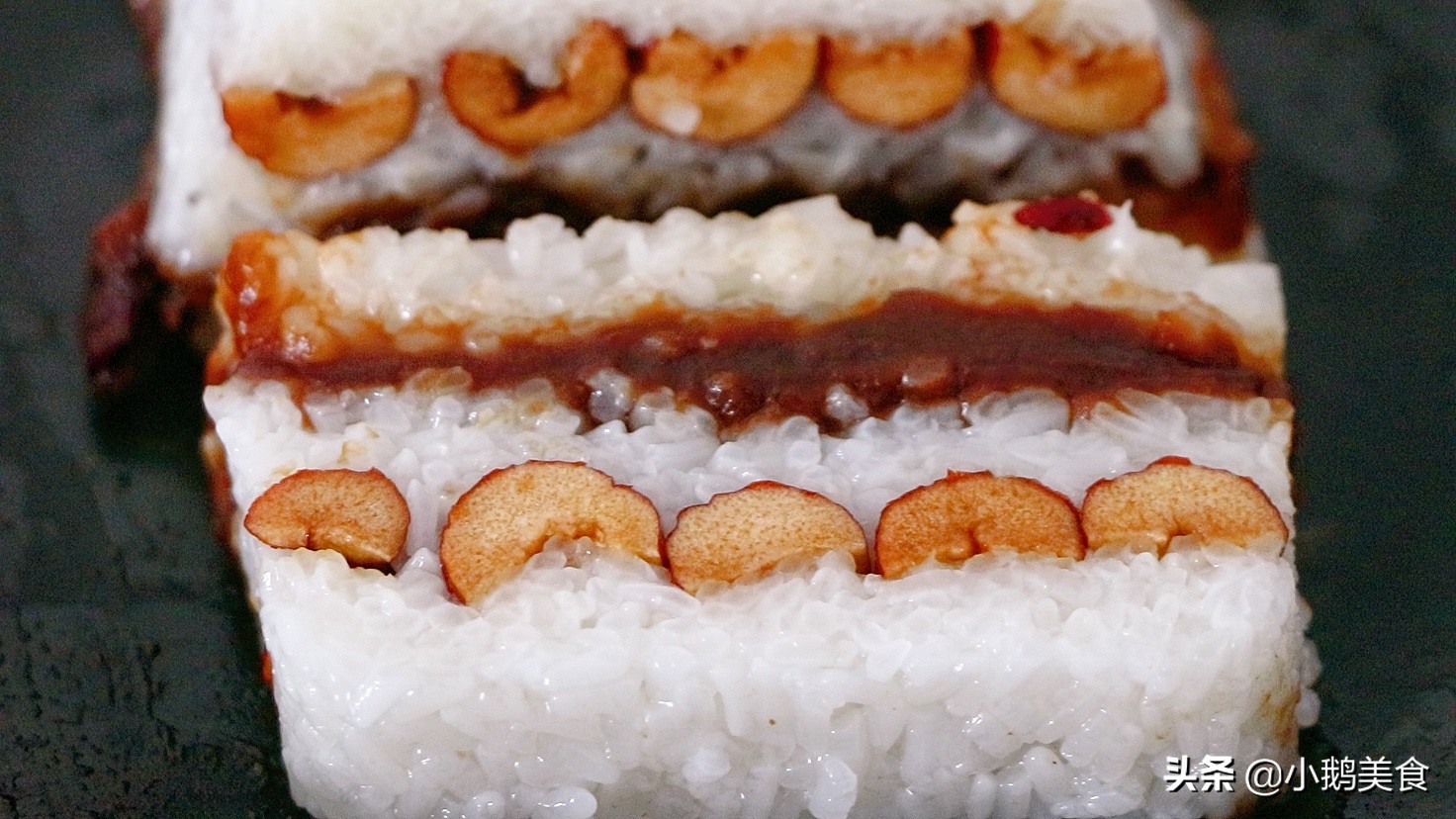 4、压好之后切片即可开吃。这样做的糯米凉糕,软糯香甜,冰凉可口,一层比一层香。一个切糕全家吃饱,太省事了。