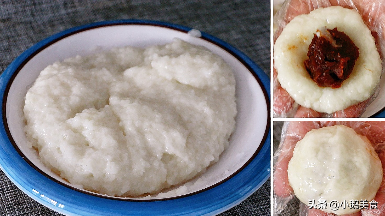 3、戴上一次性手套,把绞好的糯米揉一下,如果粘手,手套上抹一点清水。揪一小团糯米,揉圆捏扁,放上豆沙馅或喜欢的馅料,用虎口收拢。包好后可以直接吃。